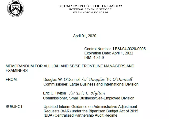 On April 1st, the IRS Large Business & International and Small Business/Self-Employed divisions issued a memorandum (LB&I-04-0320-0005) updating prior interim guidance on filing and examining an administrative adjustment request under the Bipartisan Budget Act of 2015 centralized partnership audit regime.