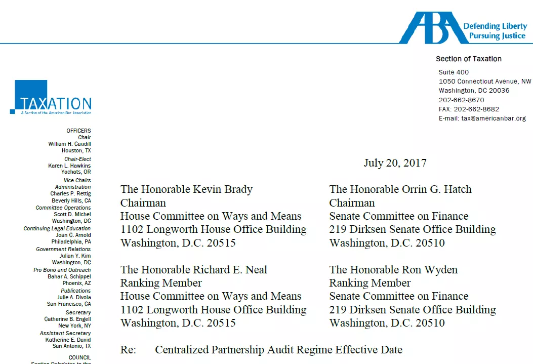 The Section of Taxation of the American Bar Association released a letter they sent on Thursday, July 20th to the House Committee on Ways and Means and the Senate Committee on Finance conveying its support to delay the new Partnership Audit Regime by one year to January 1, 2019. “Although we anticipate that Treasury and the Service will move expeditiously to finalize the proposed regulations once the comment period ending August 14, 2017 has closed and a public hearing is held on September 18, 2017, it is not realistic to believe that Treasury and the Service will issue comprehensive, final rules interpreting legislation of this magnitude in time for taxpayers and practitioners to act before January 1, 2018.??